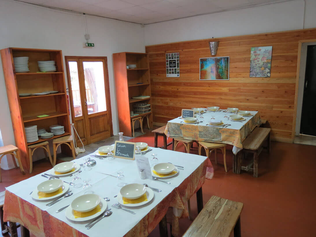 C’est la partie centrale du hameau ; On y trouve deux salles à manger d’une capacité totale de 78 personnes, la cuisine et ses dépendances, une grande terrasse où vous pouvez diner quand le temps le permet (nous sommes en altitude et les soirées peuvent être fraîches, même en plein été).