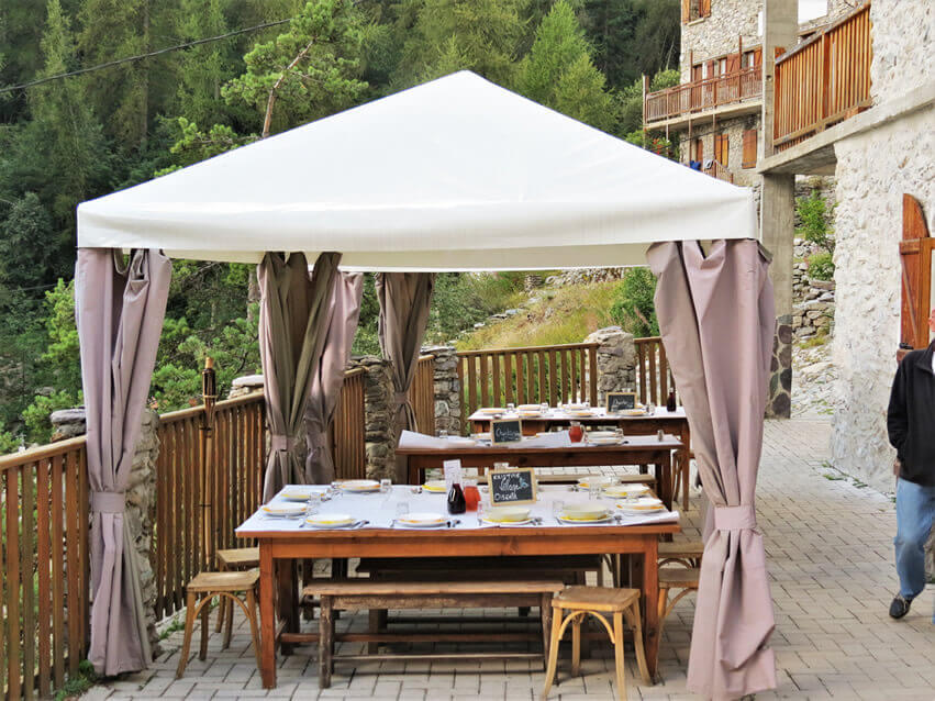 C’est la partie centrale du hameau ; On y trouve deux salles à manger d’une capacité totale de 78 personnes, la cuisine et ses dépendances, une grande terrasse où vous pouvez diner quand le temps le permet (nous sommes en altitude et les soirées peuvent être fraîches, même en plein été).